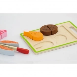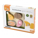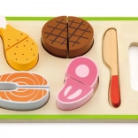 Objavte kúzlo imaginárnej kuchyne s drevenou sadou na krájanie, ktorá obsahuje štyri druhy mäsa, drevenú dosku a nôž, ideálna pre deti od 18 mesiacov.