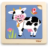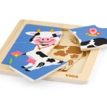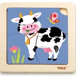 Drevené puzzle sa skladajú do podoby roztomilého obrázku kravičky, čo podporuje kreativitu.