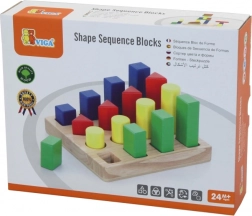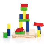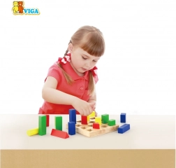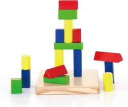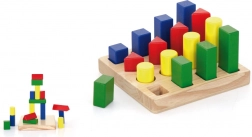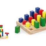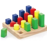 - drevená základňa s kolíkmi a sada farebných geometrických dielikov