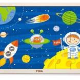 Drevené puzzle VIGA s témou vesmíru prináša deťom od útleho veku radosť z objavovania. Farebné ilustrácie s raketou, astronautom a planétami prirodzene podporujú rozpoznávanie tvarov a farieb a rozvoj oko–ruka koordinácie. Zložené puzzle má rozmer cca 27,5 × 20 cm, takže sa skvele zmestí na stôl aj do detského kútika.