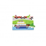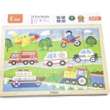 Táto drevená skladačka s obrázkami dopravných prostriedkov je skvelou voľbou pre prvé „väčšie“ puzzle. Vďaka 24 dielikom je skladanie výzvou akurát – podporuje sústredenie a radosť z dokončeného obrázka s rozmermi cca 27,5 × 20 cm. Farebné ilustrácie vozidiel (sanitka, hasičské auto, policajné vozidlo, loď, lietadlo a i.) deti prirodzene motivujú k opakovanému hraniu.