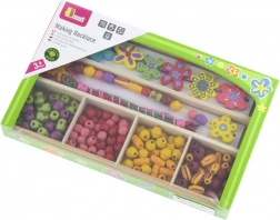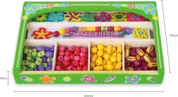 Táto drevená sada korálikov prináša deťom hodiny zábavy pri tvorbe originálnych náhrdelníkov a náramkov. V krabičke nájdete pestré koráliky rôznych tvarov a veľkostí vrátane kvetinových ozdôb a šnúrky na jednoduché navliekanie. Vďaka prehľadným priehradkám je výber korálikov jednoduchý a tvorenie prirodzene podporuje sústredenie a kreatívne vyjadrenie.