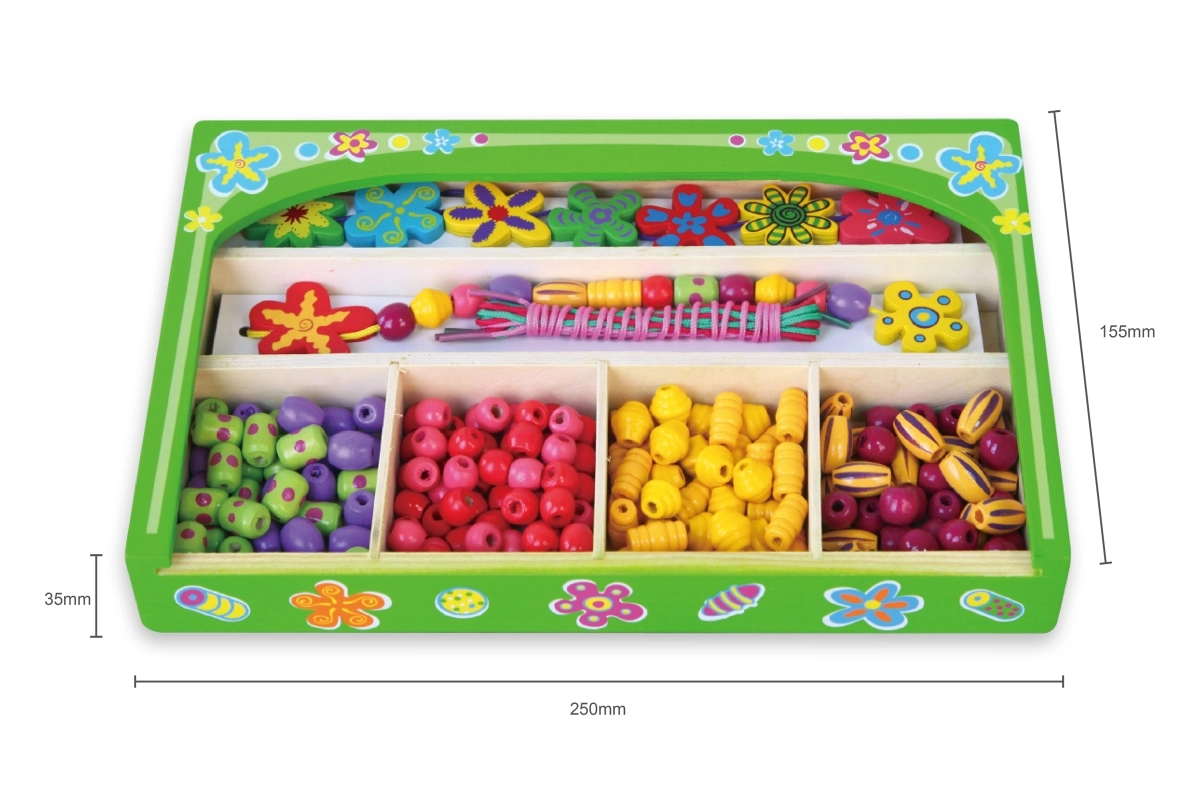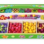 Vytvorte si vlastné šperky s touto farebnou sadou drevených korálikov s motívmi kvietkov. Ideálne pre deti od 3 rokov, rozvíja jemnú motoriku, kreativitu a koordináciu oko–ruka. Praktické priehradky udržiavajú koráliky prehľadne usporiadané a umožňujú jednoduché navliekanie náramkov a náhrdelníkov.