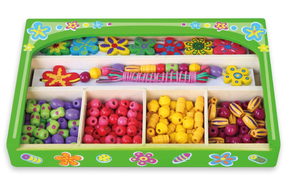 Súčasťou sú šnúrky a gumičky, vďaka ktorým môžu deti ihneď tvoriť náramky a náhrdelníky a trénovať jemnú motoriku.