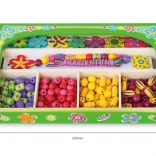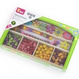 - Zmes drevených korálikov, ozdobné prvky, šnúrky na navliekanie, organizér s priehradkami