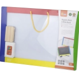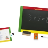 Praktická drevená obojstranná magnetická tabuľa s rozmermi 42 × 30 cm ponúka čiernu kriedovú aj bielu stierateľnú plochu; súčasťou sú 4 kriedy, fixka a hubka – ideálna pre deti od 3 rokov a rozvoj kreativity.
