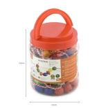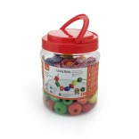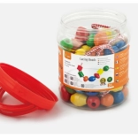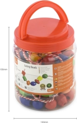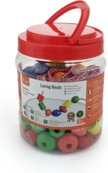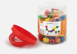 Plastová dóza obsahuje veľké drevené koráliky a farebné šnúrky, na ktoré možno koráliky navliekať. Rozmer korálika cca 2 × 2 cm podľa druhu. Rozmery balenia cca 16 × 12 cm. Obsahuje 90 korálikov a 5 šnúrok. Vek 3+