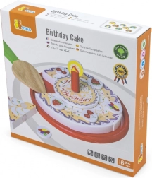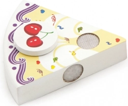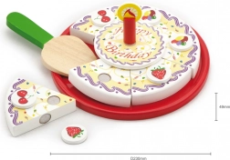 Drevená narodeninová torta na servírovacej tácke je rozdelená na jednotlivé porcie s dekoráciami a sviečkou. Vďaka suchým zipsom/magnetom (podľa prevedenia) sa dieliky ľahko oddeľujú a znova spájajú. Deti si precvičia uchopovanie, presnosť aj slovnú zásobu pri spoločnom „fúkaní sviečky“ a servírovaní.