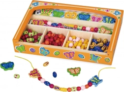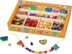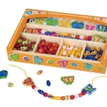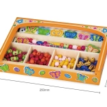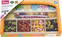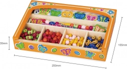 Táto bohatá sada drevených korálikov ponúka pestrú paletu farieb, tvarov a veľkostí, vďaka ktorým si deti ľahko vytvoria vlastné náramky či náhrdelníky. Prehľadné uloženie v pevnej drevenej krabičke uľahčuje organizáciu a opakovanú hru.