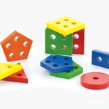 Drevená základňa s kolíkmi a farebné geometrické tvary