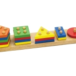 Táto pevná drevená vkladačka kombinuje triedenie a navliekanie tvarov na kolíky. Deti sa učia rozlišovať farby a geometrické tvary, precvičujú koordináciu oko–ruka a zlepšujú zručnosť pri manipulácii s dielikmi. Drevo je hladko brúsené a farby sú výrazné a atraktívne.