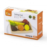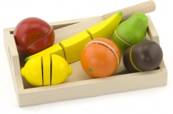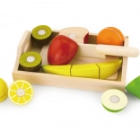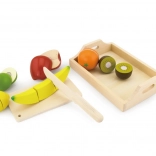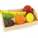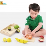 Ovocie a nôž sú vyrobené z prírodného dreva, čo zaisťuje bezpečnosť a odolnosť pri hre.