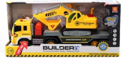 Zábavná sada pre malých vodičov obsahuje veľký ťahač a bager v mierke 1:16. Ťahač po stlačení tlačidiel na kapote vydáva realistické zvuky a svieti, nechýba sklopná plošina na jednoduché nakladanie. Súčasťou sú gombíkové batérie. Vhodné pre deti od 3 rokov.