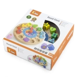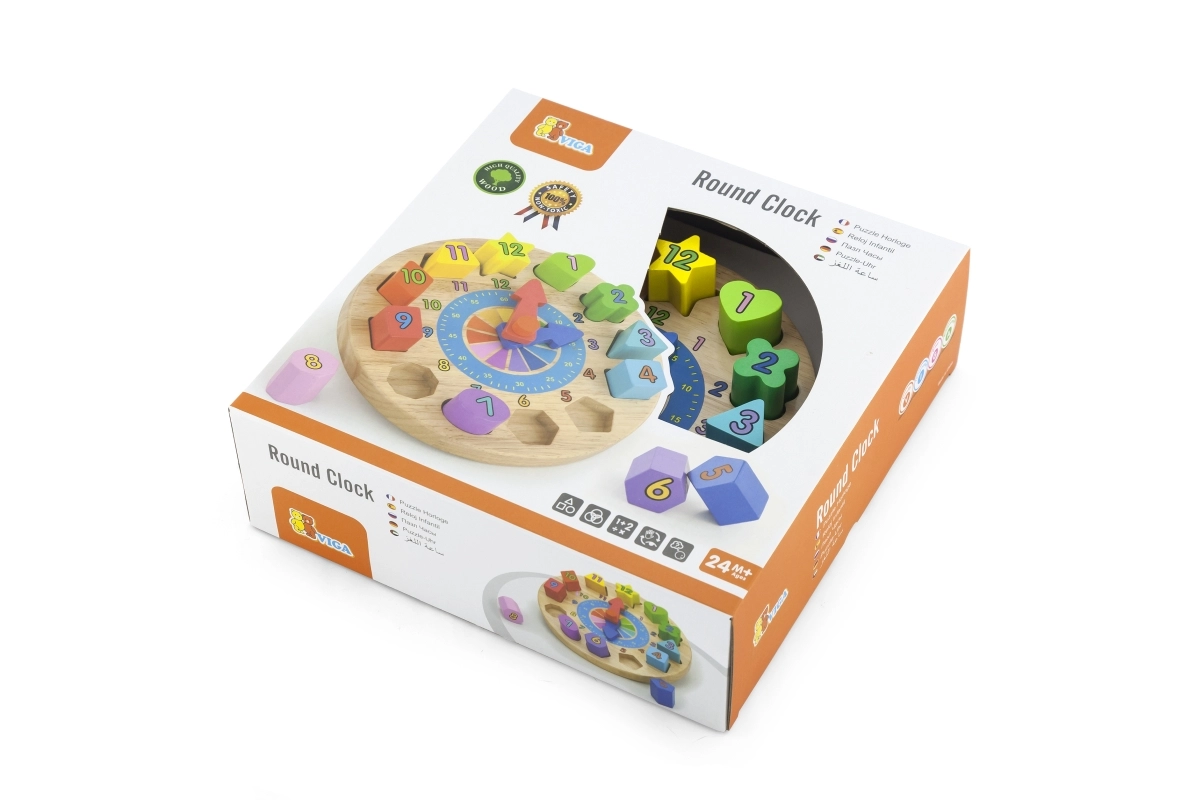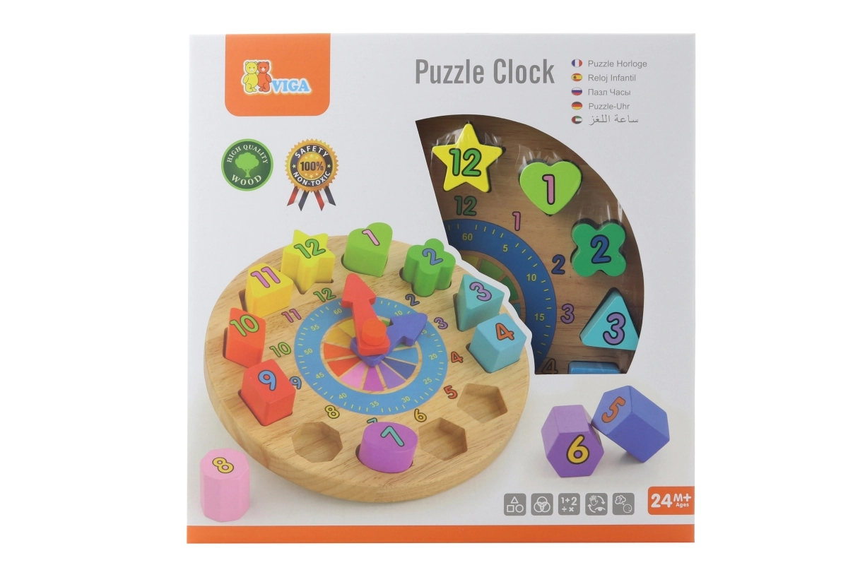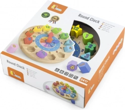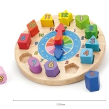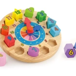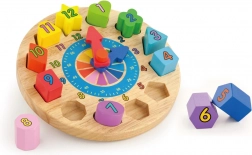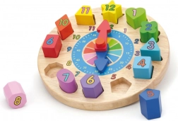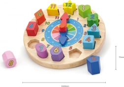 Zábavné a vzdelávacie drevené hodiny pre najmenších pomáhajú učiť sa poznávať čas, farby a tvary. Obsahujú 12 farebných vkladacích dielikov s číslami, ktoré rozvíjajú jemnú motoriku, logiku a koordináciu oko–ruka. Ideálna hračka pre deti od 24 mesiacov.