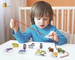 Set obsahuje farebné drevené bloky a šnúrku, ktoré učia deti zručnosti a trpezlivosti prostredníctvom navliekania.