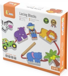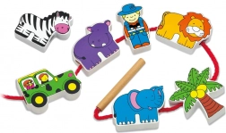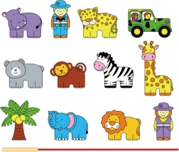 Sada obsahuje drevené kocky, ktoré zobrazujú obyvateľov safari vrátane leoparda, palmy, opice, hrocha, zebry, džípu, žirafy, medveďa, leva, slona a sprievodcu. Kocky sú precízne maľované z oboch strán netoxickými farbami a prinášajú deťom veľa radosti pri hraní. Všetky prvky sú navrhnuté tak, aby podporovali rozvoj jemnej motoriky a znalosti zvieracieho sveta.