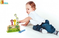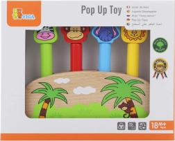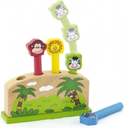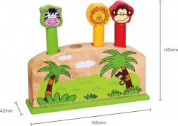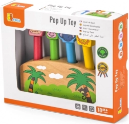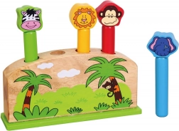 Zábavná drevená hra pre najmenších, v ktorej po stlačení farebných kolíkov so zvieratkami figúrky veselo vyskočia. Podporuje jemnú motoriku, koordináciu ruka–oko a zvedavú hru už od 18 mesiacov.
