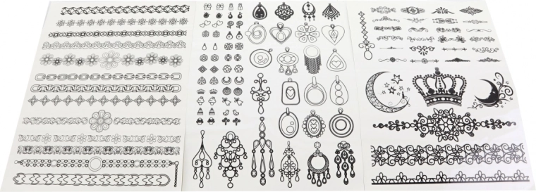 Objavte svet dočasného tetovania a ozdôb, ktoré si môžete prispôsobiť presne podľa svojej nálady. Sada ponúka bohatý výber motívov – od elegantných liniek a retiazok až po korunky, mesiace a ornamenty – a farebné fixky na dokreslenie detailov. Trblietavé kamienky dodajú každému motívu efektný lesk.