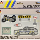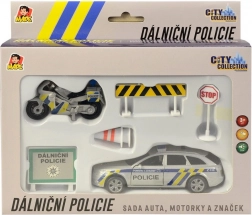 Realistická súprava diaľničnej polície v českom dizajne zo série City Collection poteší všetkých malých ochrancov zákona. Obsahuje kovové policajné auto so svetelným a zvukovým majákom, plastovú motorku a dopravné značky. Vďaka pohonu na spätné natiahnutie je akcia na ceste hneď v plnom prúde. Ideálne pre deti od 3 rokov.
