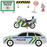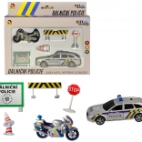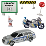 - Kovové policajné auto, plastová motorka, plastové dopravné značky