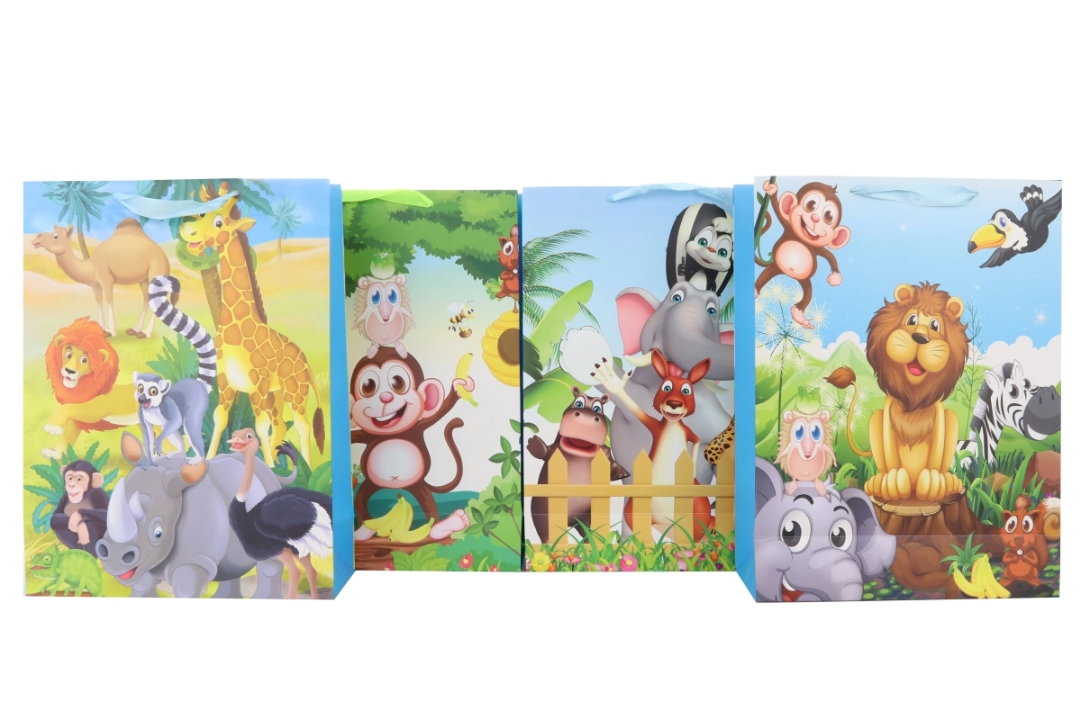 Štýlová darčeková taška s motívom safari vo veľkom formáte poteší každého obdarovaného. Vďaka rozmerom cca 50 × 40 cm pojme aj väčšie darčeky a jej pevné prevedenie zaistí pohodlné a bezpečné prenášanie. Skvelá voľba na narodeniny, sviatky aj iné príležitosti. Dostupná v 4 rôznych dizajnoch s motívmi safari.