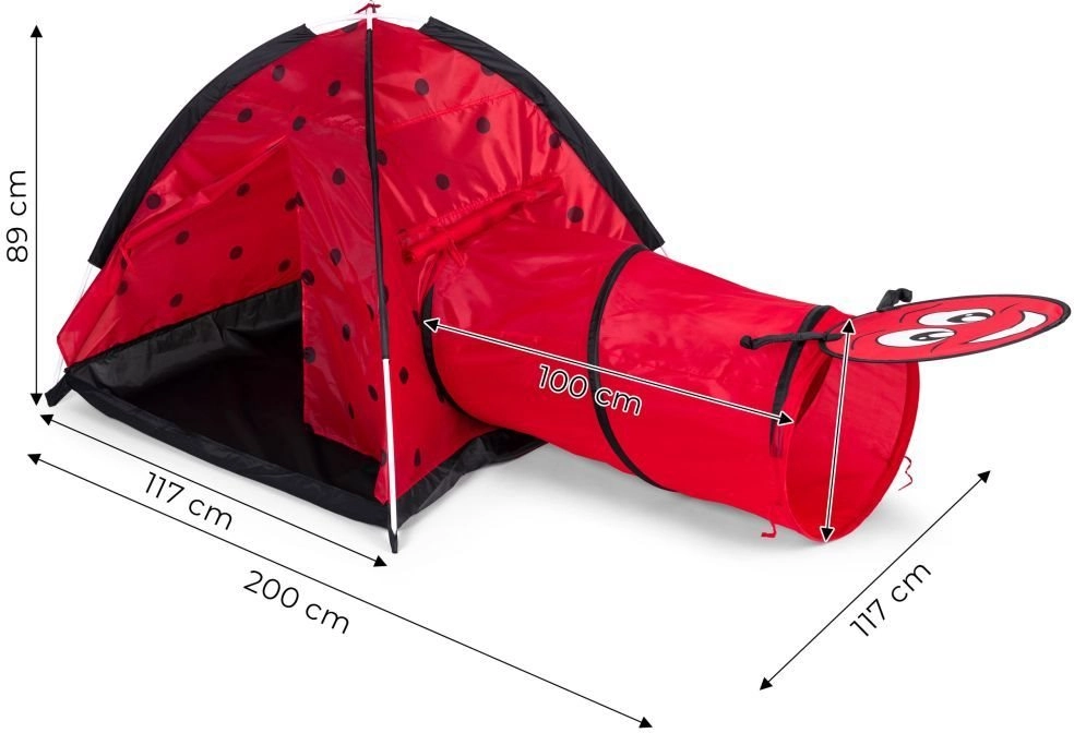 Premeňte izbu alebo záhradu na miesto plné dobrodružstiev. Detský stan s motívom lienky láka deti k objavovaniu a tvorivej hre. Iglu konštrukcia s jedným vstupom a napojením pre tunel podporuje pohyb, preliezanie a schovávanie, čo rozvíja motoriku aj fantáziu. Vďaka ľahkému rámu stan ľahko prenesiete, takže si ho deti užijú kdekoľvek.
