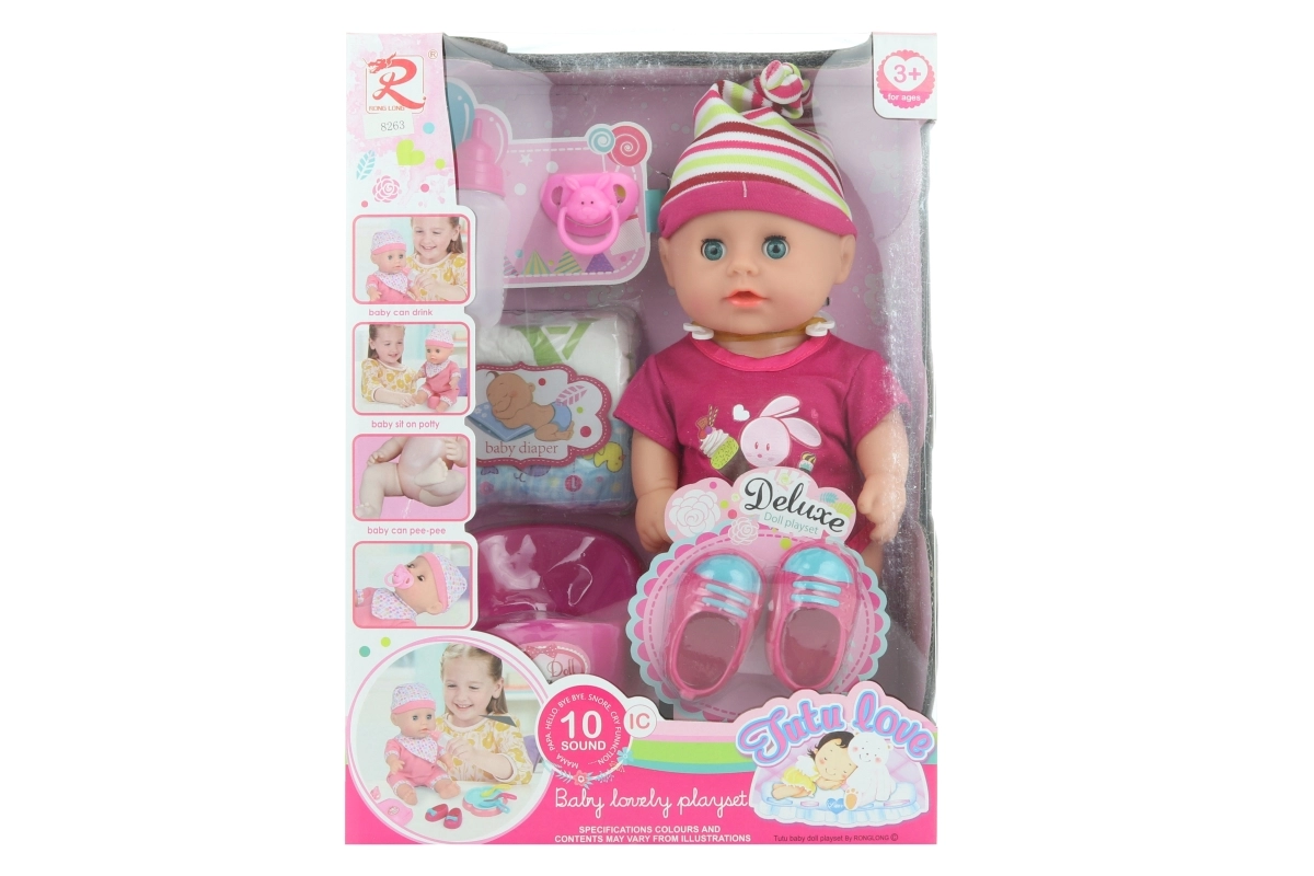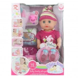 Roztomilé bábätko s veľkosťou 30 cm, ktoré po vložení batérií vydáva realistické zvuky a vie cikať. V balení nájdete bohatú sadu doplnkov vrátane čižmičiek, plastového podbradníka, fľaštičky a tanierika. Súčasťou sú aj batérie, takže sa deti môžu hrať hneď po rozbalení.