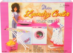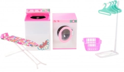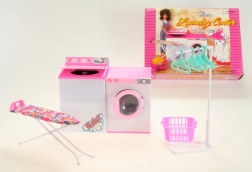 • Obsah sady: práčka (otváracie predné veko), sušička (otváracie horné veko), žehliaca doska, žehlička pre bábiky, stojan na šaty s 5 vešiakmi, košík na bielizeň