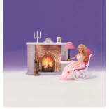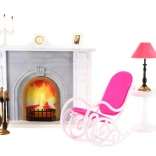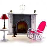 - Plastový krb, svietnik, obrázok, hodiny, hojdacie kreslo, stolček s lampou, stojan s krbovým náradím