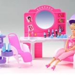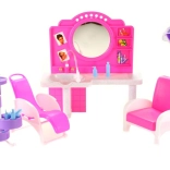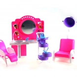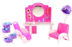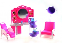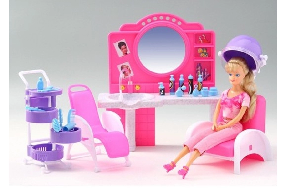 Štýlový herný set Glorie kadernícky salón prinesie deťom veľa zábavy pri hre na kaderníctvo. Obsahuje toaletný stolík so zrkadlom a umývadlom, pohodlné kadernícke kreslá, vozík s priehradkami a radu doplnkov na úpravu vlasov, ako sú hrebienky, kefy a fľaštičky. Vyrobené z odolného plastu. Bábika nie je súčasťou balenia. Vhodné pre deti od 3 rokov.