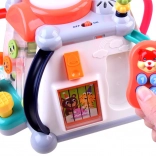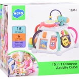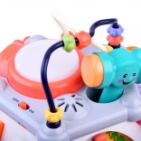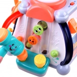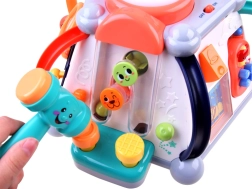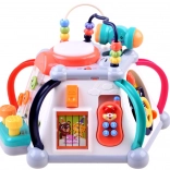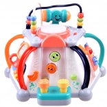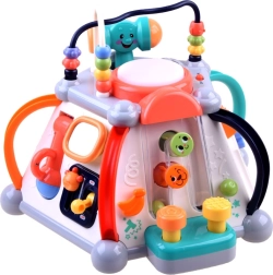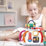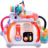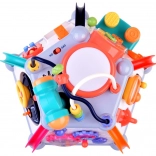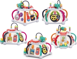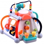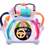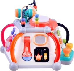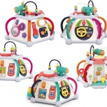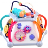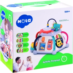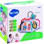 Multikocka HOLA prináša bohatú paletu aktivít pre najmenších. Každá stena ponúka iný typ hry – od riadenia autíčka cez ozubené kolá so svetlami a melódiami až po mikrofón s podsvieteným „televízorom“. Horná strana ukrýva labyrinty s korálikmi, svietiaci bubienok a miesto na uloženie kladivka. Všetko je navrhnuté pre malé detské ruky a bezpečné objavovanie.