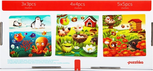 Objavte hravé učenie s puzzlom Puzzlika obľúbené zvieratká 3 v 1. Balenie obsahuje spolu 50 veľkých dielikov, z ktorých deti poskladajú 3 samostatné obrázky 25 × 25 cm s rôznou náročnosťou (3×3, 4×4, 5×5). Vďaka pestrým motívom zvierat a výrazným farbám je skladanie atraktívne a motivujúce pre deti predškolského veku.