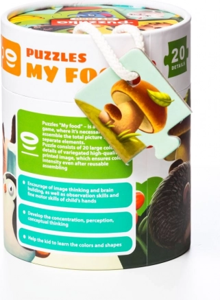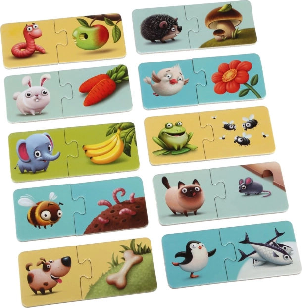 Táto logická hra učí deti správne spájať zvieratko s jeho obľúbeným jedlom – napríklad slona, ježka, žabu či červa. Po zložení dvojice si deti hravou formou upevňujú vedomosti o zvieratách a ich potrave, zároveň trénujú postreh a koordináciu oko–ruka.