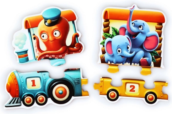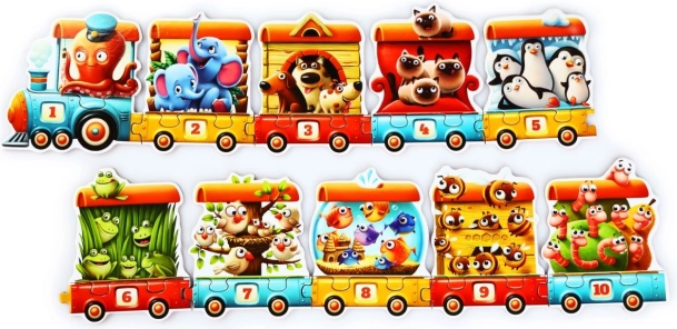 Toto farebné náučné puzzle je navrhnuté pre radostné učenie hrou. Každý vagónik tvorí dvojica dielikov – na jednom je ilustrácia skupinky zvieratiek, na druhom zodpovedajúca číslica. Deti tak ľahko pochopia princíp párovania a radenia čísel za sebou.