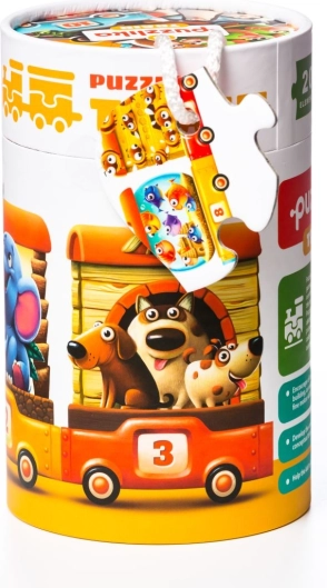 Zábavné a vzdelávacie puzzle Puzzlika Vlak pre najmenších pomáha deťom učiť sa čísla 1–10, rozpoznávať zvieratká a precvičovať logické myslenie aj jemnú motoriku. Z 20 pevných dielikov zložíte 94 cm dlhý vláčik s lokomotívou a vagónikmi, kde každému počtu zvieratiek zodpovedá správna číslica.