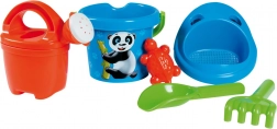 Roztomilá 6-dielna sada do piesku ANDRONI s motívom pandy poteší malých staviteľov na pláži aj v pieskovisku. Je vyrobená v Taliansku z kvalitného plastu, je bezpečná od 12 mesiacov a obsahuje všetko potrebné: vedierko (Ø 13 cm, výška 11 cm), kanvičku 0,5 l, sitko, lopatku, hrabličky a formičku v tvare korytnačky.