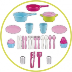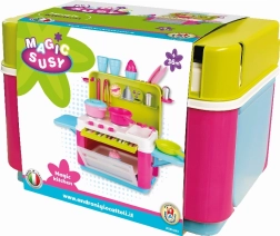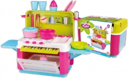Táto pultová kuchynka je ideálna na cesty aj do malých detských izieb. Vďaka dvom bočným, nosným a odnímateľným doskám ponúka viac priestoru na hranie a zároveň sa ľahko prenáša. Súčasťou je rúra s plechom, varná doska, drez s batériou a bohatá sada riadu – všetko pre realistickú hru na varenie.