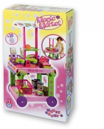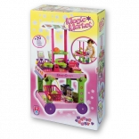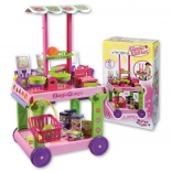 - Pojazdný vozík s odnímateľnou strieškou, bočný výsuvný pult, 4 košíky s rukoväťou, pokladňa s mincami, váha s miskami, 12 ks ovocia a zeleniny, 8 krabičiek s tovarom