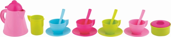 Kanvica, 4 hrnčeky s podšálkami, 4 lyžičky, cukornička s viečkom a kanvička na mlieko – všetko v jasných farbách pre zábavnú hru na kaviareň.