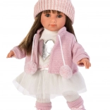 Každá malá slečna ocení štýlový zimný outfit s ružovým pleteným klobúčikom, bundou a tutu sukňou. Oblečenie kombinuje textilné a plastové materiály, ktoré sú navrhnuté pre hravé príležitosti.