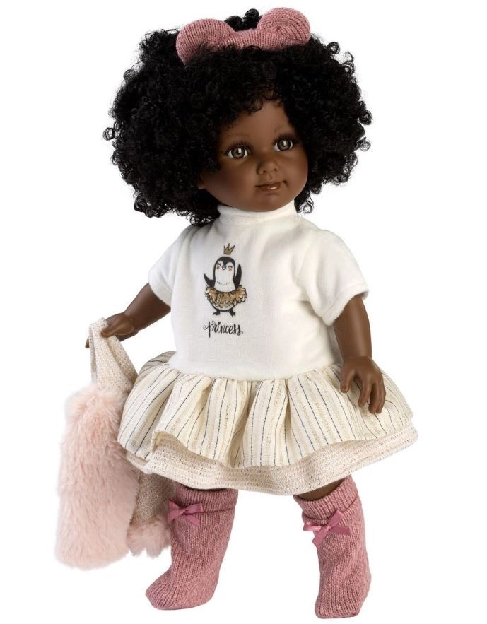 Objavte kúzelnú bábiku Llorens Zuri 35 cm – elegantnejšia tmavšia pleť, bohaté kučeravé vlásky s ružovou mašľou a štýlový outfit z hebkých látok. Ruky, nohy aj hlavička z jemného vinylu, mäkké textilné telíčko na pohodlné maznanie. Ručná výroba v Španielsku a bezpečnosť podľa noriem EÚ zaručujú kvalitnú a bezpečnú hru.
