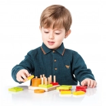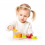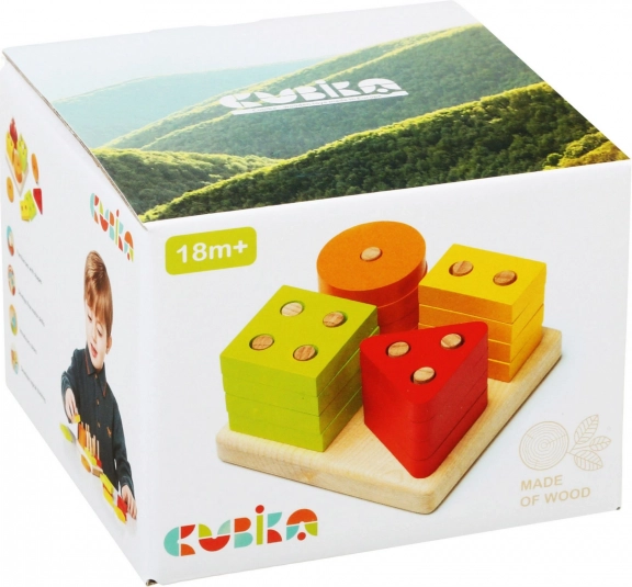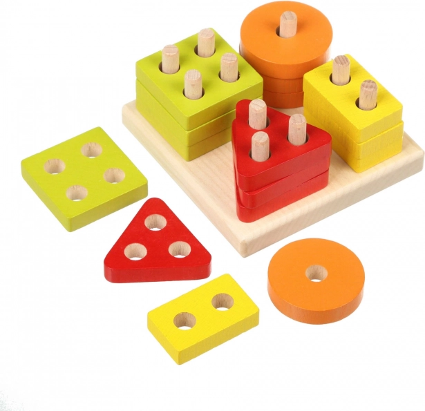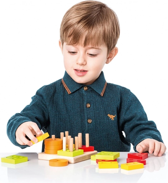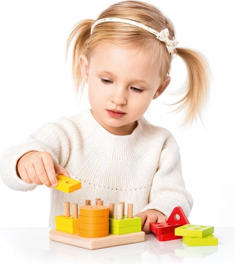 Farebné kruhy, štvorce, trojuholníky a obdĺžniky s otvormi sa nasadzujú na kolíky základne. Deti tak prirodzene triedia podľa tvaru aj farby a precvičujú logické myslenie.