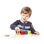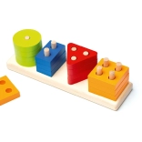 Táto kvalitná drevená skladačka ponúka 16 farebných geometrických tvarov, ktoré sa navliekajú na kolíčky na obdĺžnikovej základni. Deti sa pri hre učia rozpoznávať farby a tvary, skúšajú rôzne kombinácie a prirodzene trénujú koordináciu aj trpezlivosť.