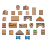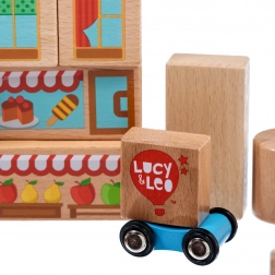 Postavte si vlastné malebné mestečko z precízne spracovaných drevených kociek a vyberte sa na výlet s dvomi malými autíčkami. Diely rôznych tvarov – kvádre, trojuholníky, valce aj mostíky – sa skvele kombinujú a motivujú deti ku kreatívnemu stavaniu aj k voľnej hre.