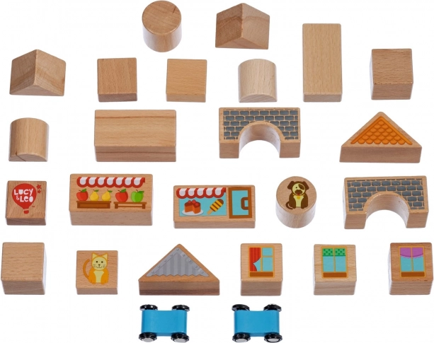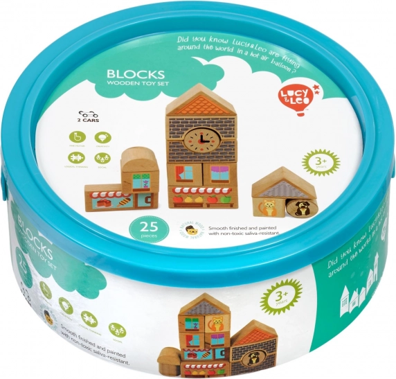 Objavte čaro kreatívneho stavan ia s drevenou sadou Lucy & Leo mesto. Sada obsahuje 25 kvalitných drevených dielov vrátane 2 pojazdných autíčok, rôznych tvarov a farieb na stavbu domčekov a uličiek. Ilustrované prvky ako okná, strechy a výklady obchodov podnecujú fantáziu a tematickú hru. Hračka podporuje jemnú motoriku, logické myslenie a kreativitu a po hraní ju ľahko uložíte do praktického okrúhleho boxu s vekom a držadlom.