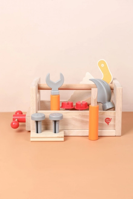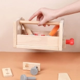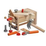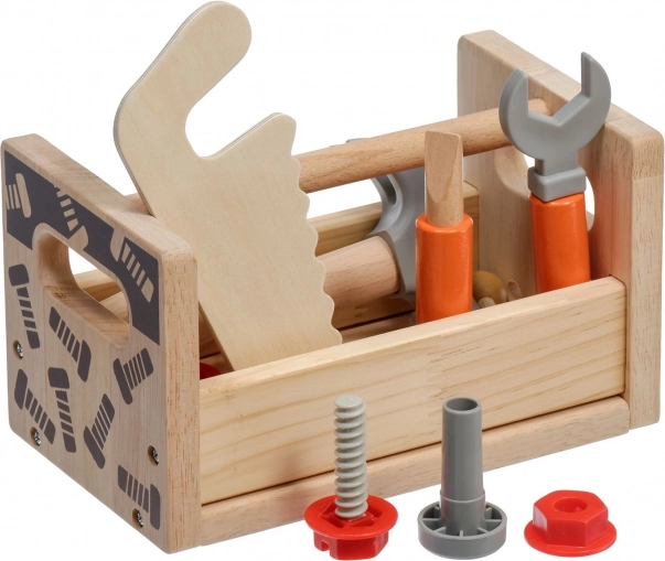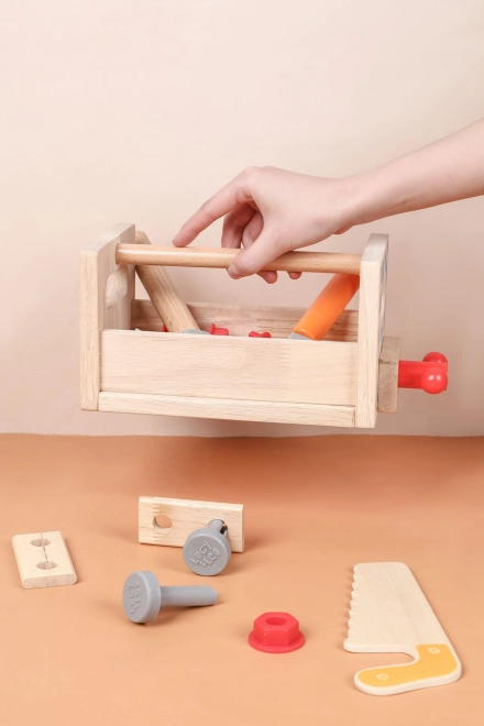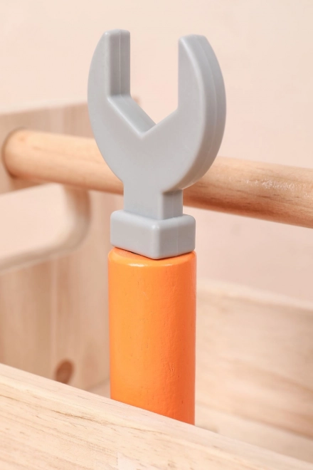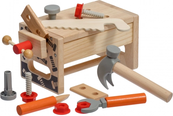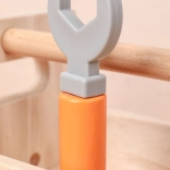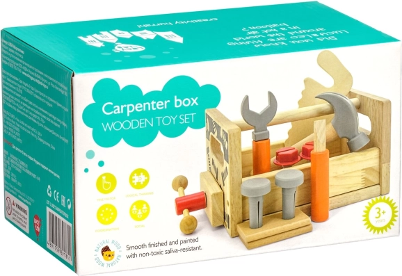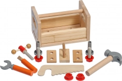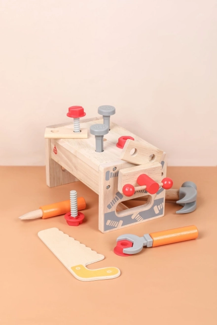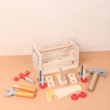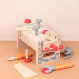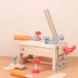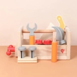 Súčasťou setu je rozmanité detské náradie: kladivo, pílka, skrutkovač, kľúč, skrutky a matice, zverák a hladké drevené dieliky s otvormi. Všetko má svoje miesto, takže sa deti učia poriadok aj základné techniky práce so spojovacím materiálom. Hra podporuje kreatívne stavebné hry, koordináciu oko–ruka a trpezlivosť.