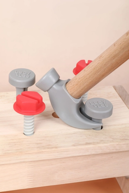 Kladivo, pílka, skrutkovač, kľúč, skrutky, matice, zverák a drevené dieliky s otvormi – všetko pre realistické hranie a učenie.