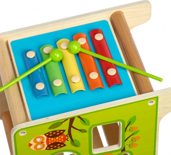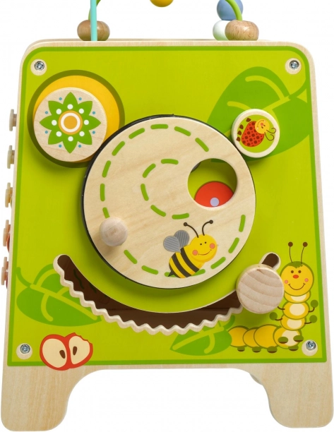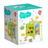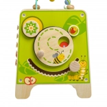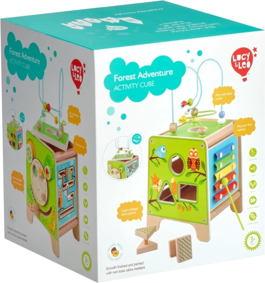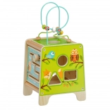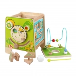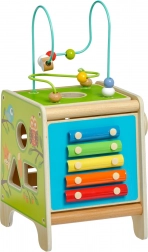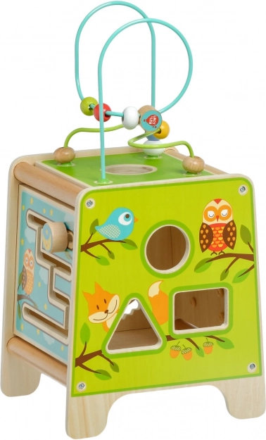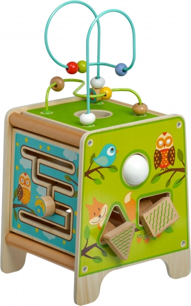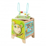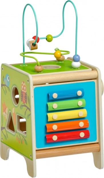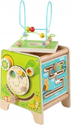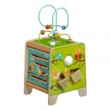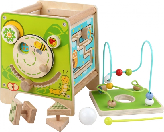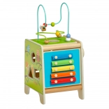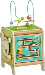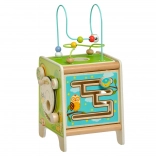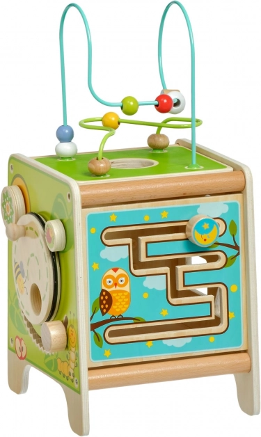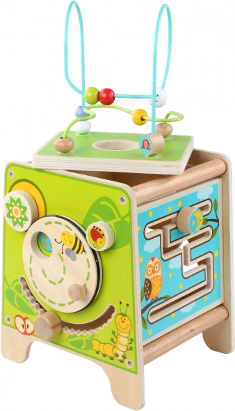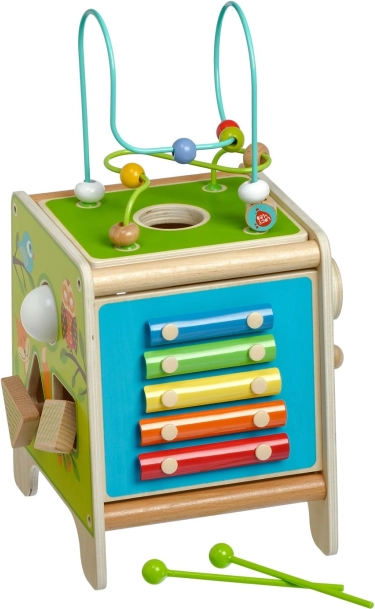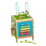 Táto farebná drevená aktívna kocka prináša deťom hodiny zmysluplnej hry. Vrchný korálkový labyrint možno vybrať a otočiť dovnútra kocky pre jednoduché uloženie. Na bočných stranách deti objavia xylofón s paličkami, vkladačku dvojdielnych rotačných geometrických tvarov, motorické bludisko, rotujúce koliesko, otočné prvky a zábavnú hru s presúvaním kolíčka v drážke.