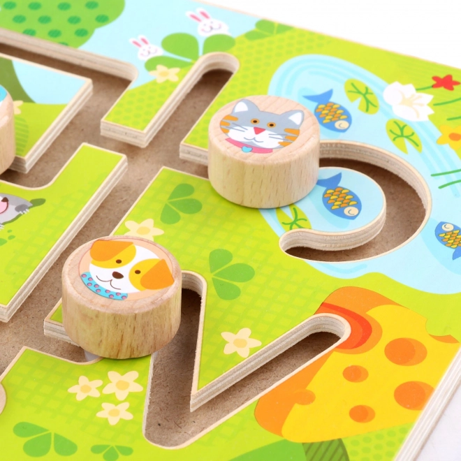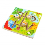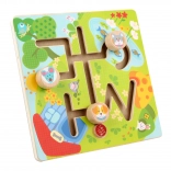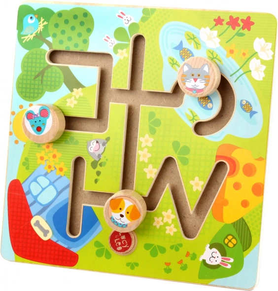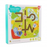 Drevený labyrint Slnečné údolie prináša deťom radosť z objavovania aj učenia. Ilustrovaná hracia doska s jazierkom a zeleňou vtiahne deti do hry, kde pes, mačka a myška putujú k svojim cieľom. Vďaka plynulým drážkam sa figúrky ľahko posúvajú a hra je tak bezpečná a intuitívna.