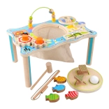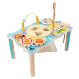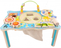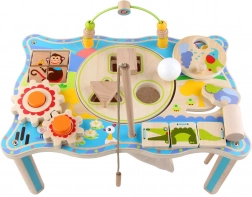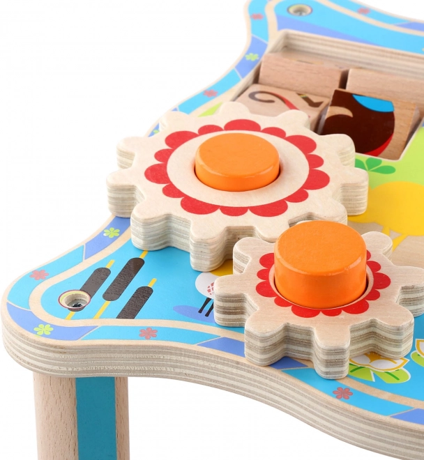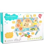 Drevený stolík s džungľovými motívmi prepája zábavu s učením a podporuje jemnú motoriku, koordináciu oko–ruka aj logické myslenie. Deti môžu otáčať ozubenými kolieskami, posúvať koráliky po dráhe, trénovať silu i sústredenie so zatláčadlom a precvičovať rozpoznávanie tvarov vďaka vkladacej hre. Uprostred je ľanové vrecúško na ulovené rybičky a herné dieliky, ktoré udržiava hernú plochu prehľadnú.